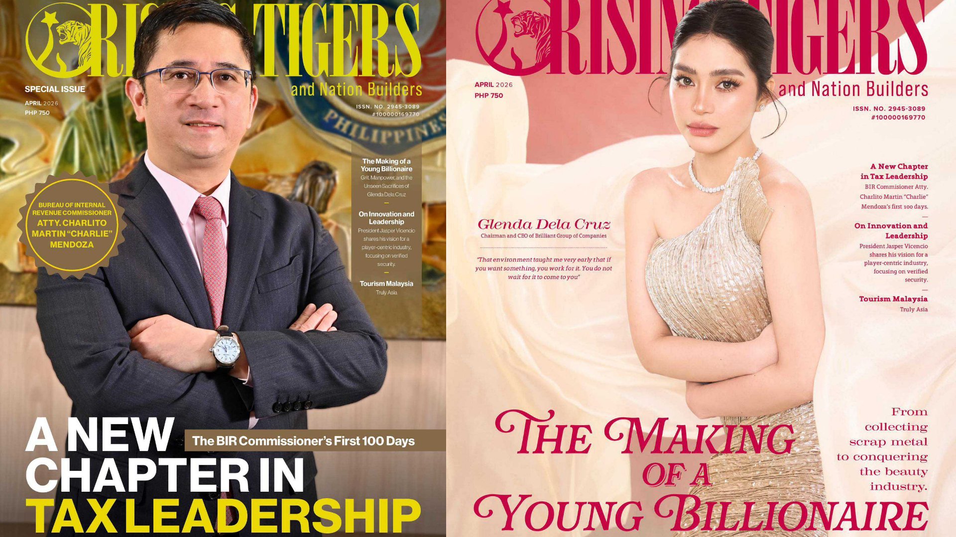 The April 2026 issue of Rising Tigers Magazine features two influential personalities whose impact reflects the synergy between enterprise and public service. On one cover is Glenda Dela Cruz, Founder of Brilliant Skin Essentials, Inc., whose inspiring entrepreneurial journey has made her one of the country’s most prominent young business leaders. On the other cover is Charlito Martin R. Mendoza, Commissioner of the Bureau of Internal Revenue (BIR), whose leadership highlights transparency, reform, and strengthened tax compliance in the Philippines.